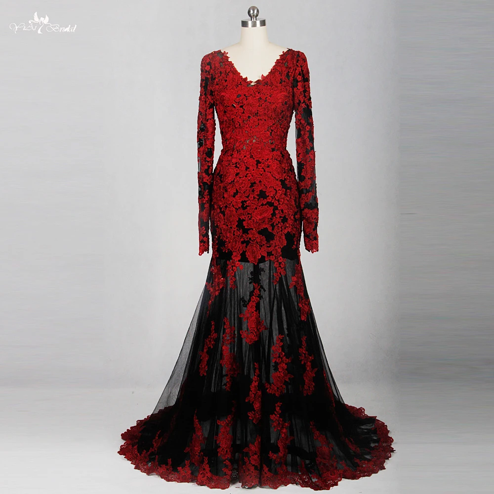 Rse776 Red Black See Through Back Low Long Sleeve V Neck Mermaid