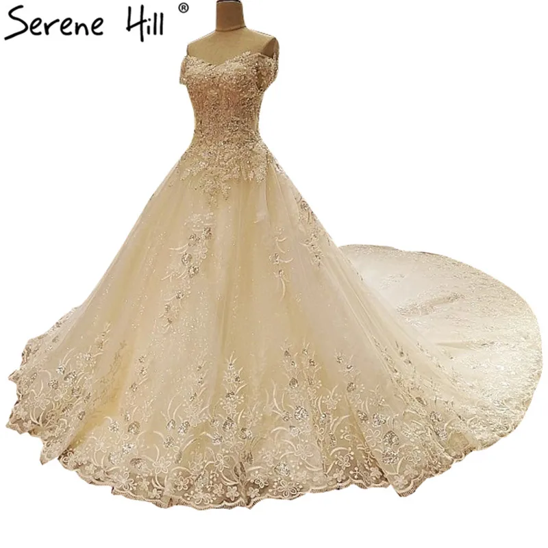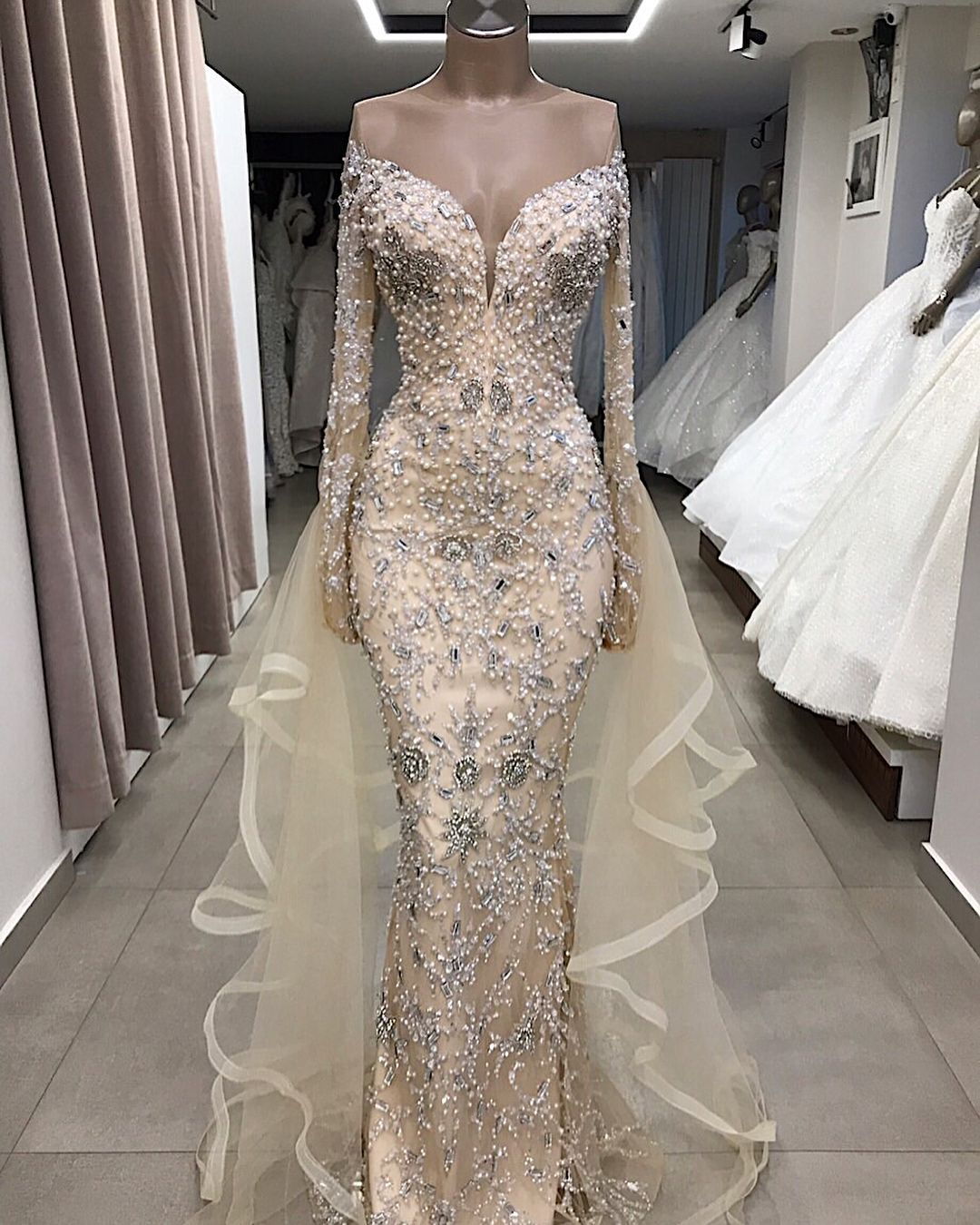 Champagne Pearl Beaded Mermaid Wedding Dresses Luxury Sparkly Off