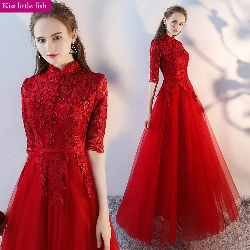 Free Shipping 2019 New Long Red Lace Prom Dress Elegant Women