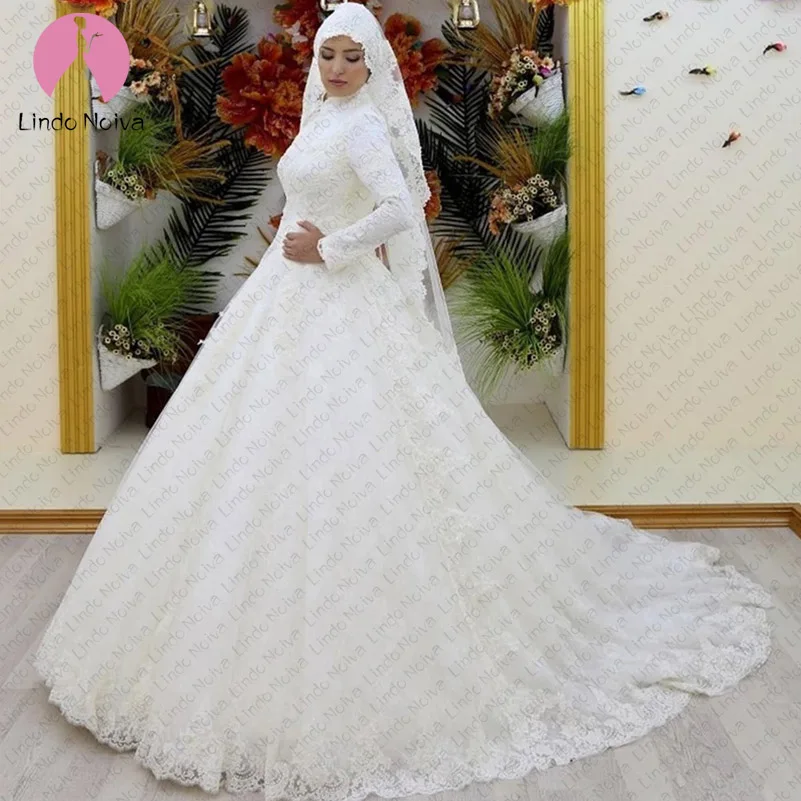 New Arrival 2019 Muslim Long Sleeve High Neck Wedding Gown White