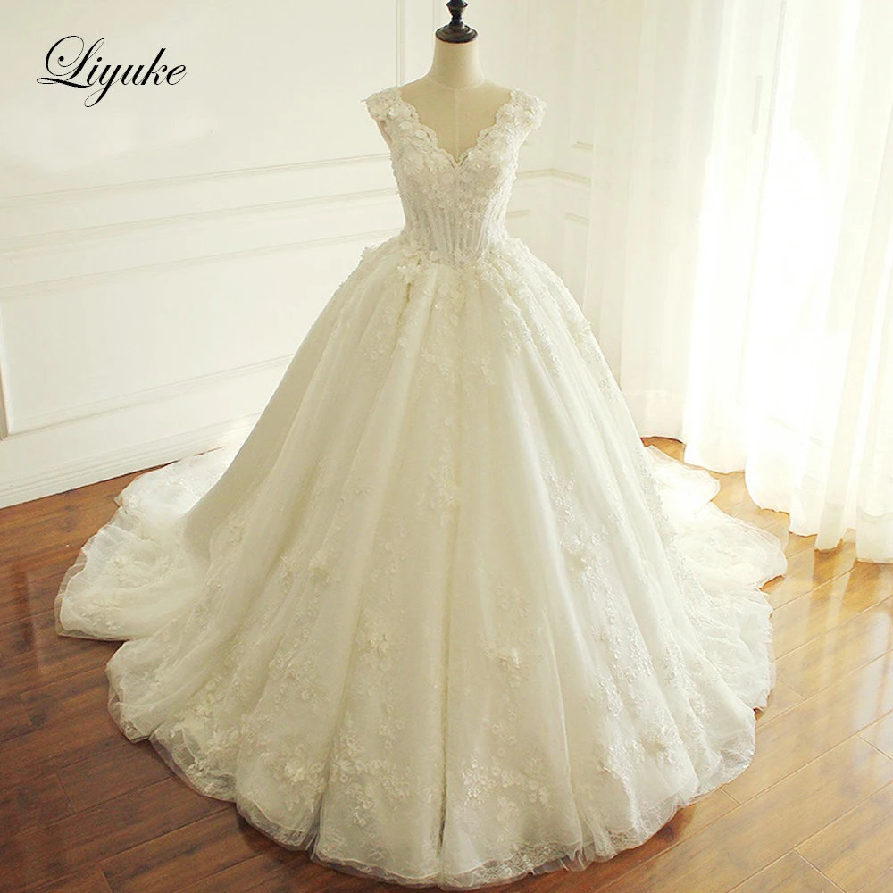 Best Seller Liyuke Ivory Color Ball Gown Wedding Dress 3d Flowers