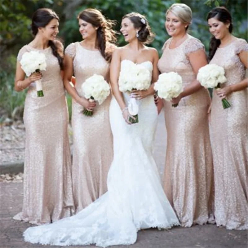 Champagne Gold Long Bridesmaid Dresses Sequined Short Sleeve Floor