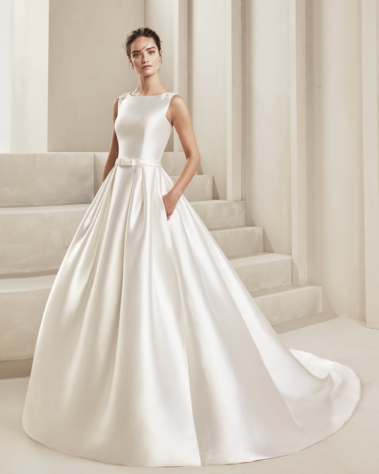 Puffy Satin Scoop Neck Long Backless Wedding Dress With Pockets