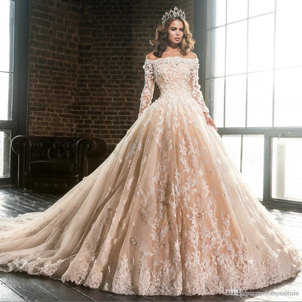 Discount Vintage Boat Neck Long Sleeve Lace Appliques Ball Gown