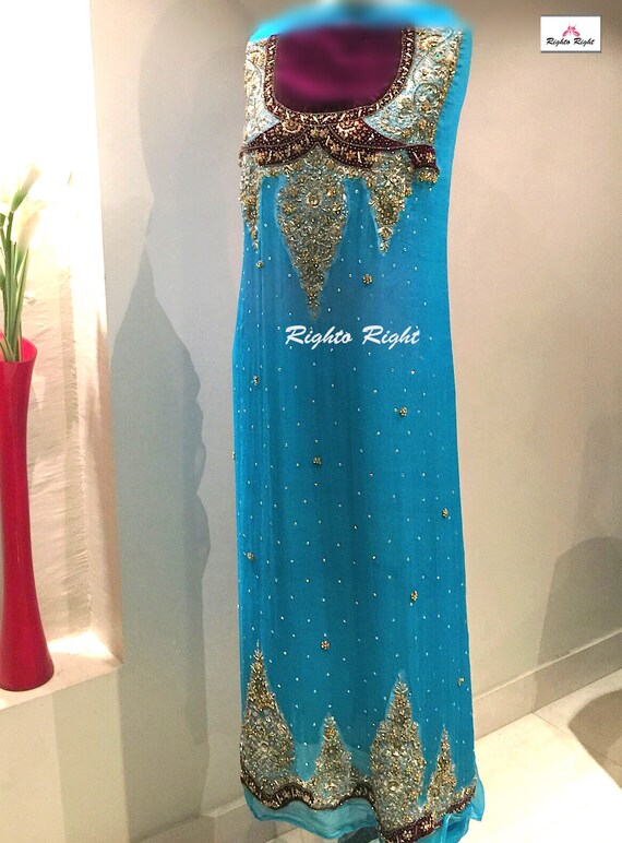 Traditional pakistani designer dress in aqua blue color with eye catching embroidery. Usually a yellow color dress is worn with green combinations but now cameroon white pink and blue are also added to it.