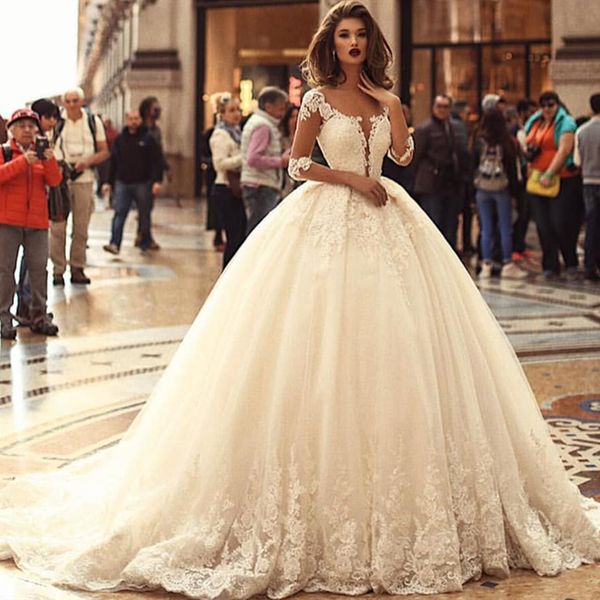 Ball Gown Wedding Dresses 2019 Big Puffy Half Sleeve Lace Wedding