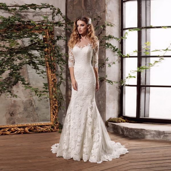 Vivian S Bridal Illusion Mesh Half Sleeve Mermaid Wedding Dress