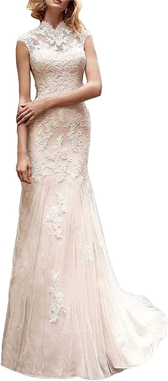 Anff Womens High Neck Wedding Dress Lace Appliques Mermaid Wedding