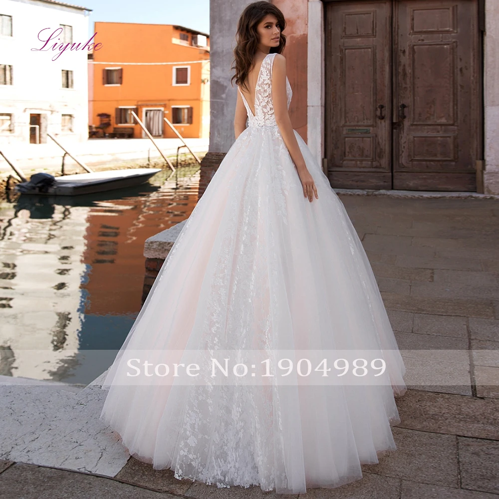 Liyuke Married Ball Gown Wedding Dress V Neck Lace Appliques