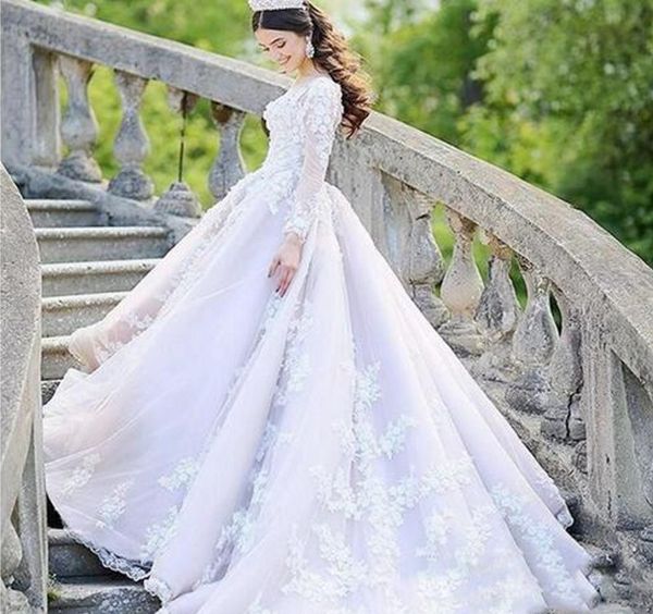 Luxury Ball Gown Wedding Dresses 2018 Sheer Neck Long Sleeves