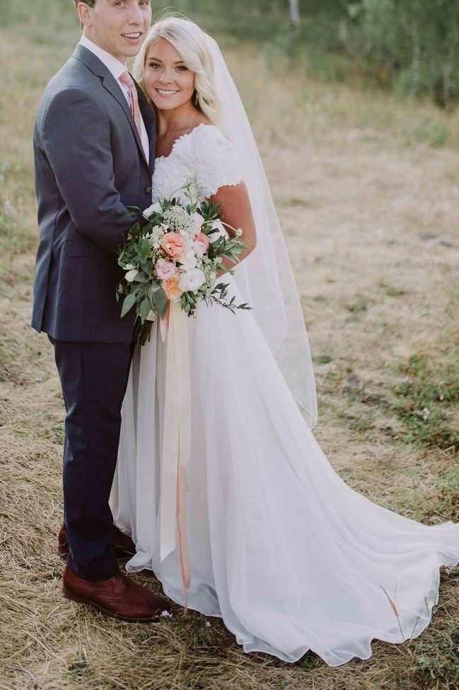 Discount New A Line Modest Wedding Dresses With Short Sleeves Lace