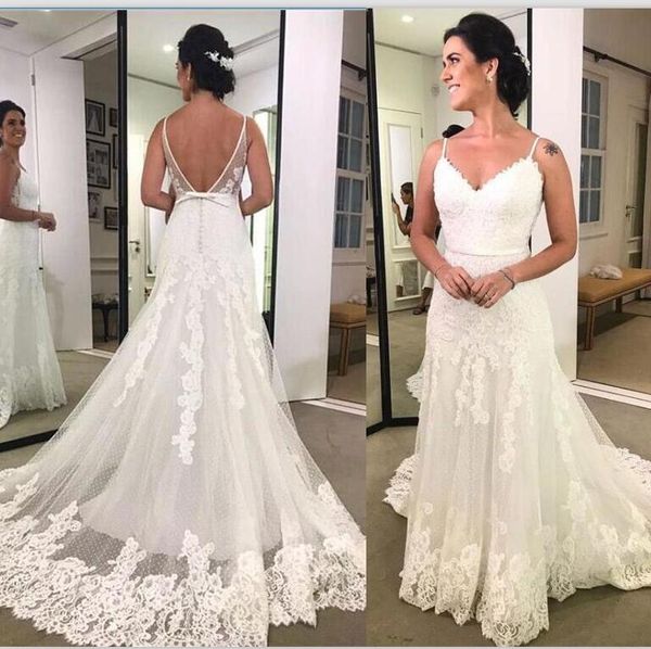 Vintage Full Lace 2019 Wedding Dresses V Backless Sweep Train