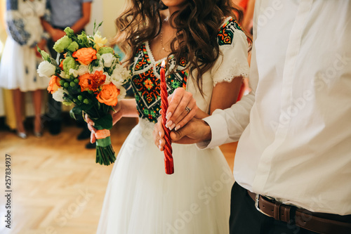 Groom And Bride In Embroidery Dress Are Holding Candle Beautiful