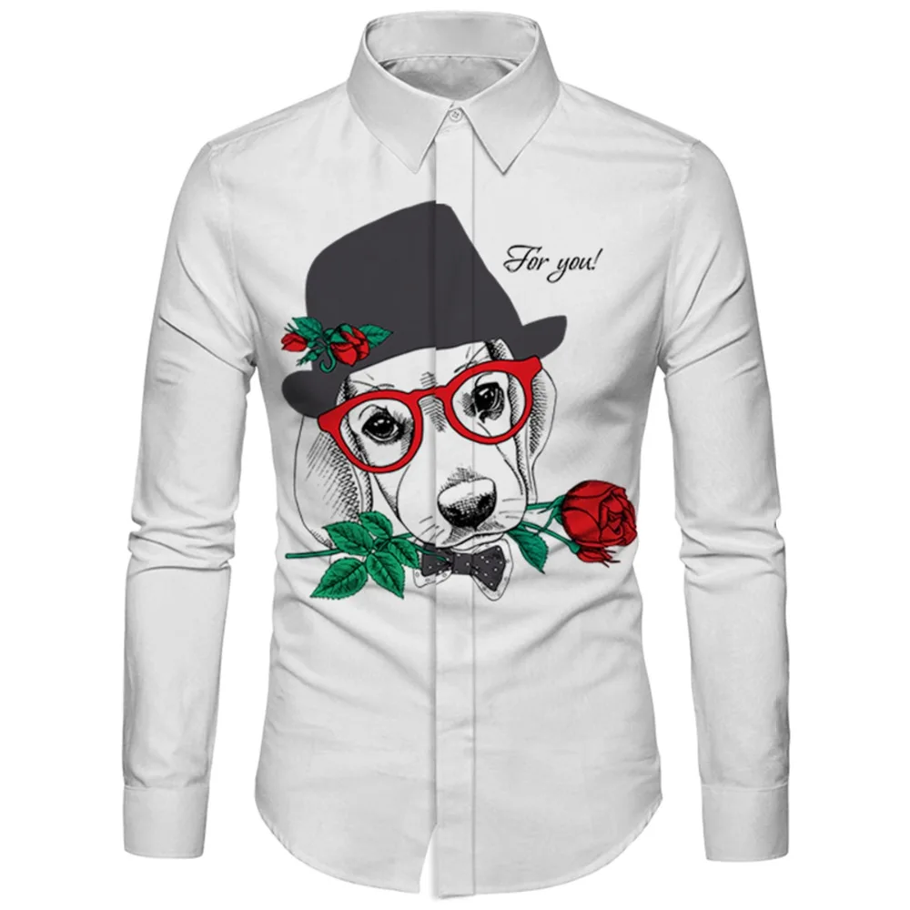 Cloudstyle Men Shirt Long Sleeve Animal Dog Rose Green Leaves